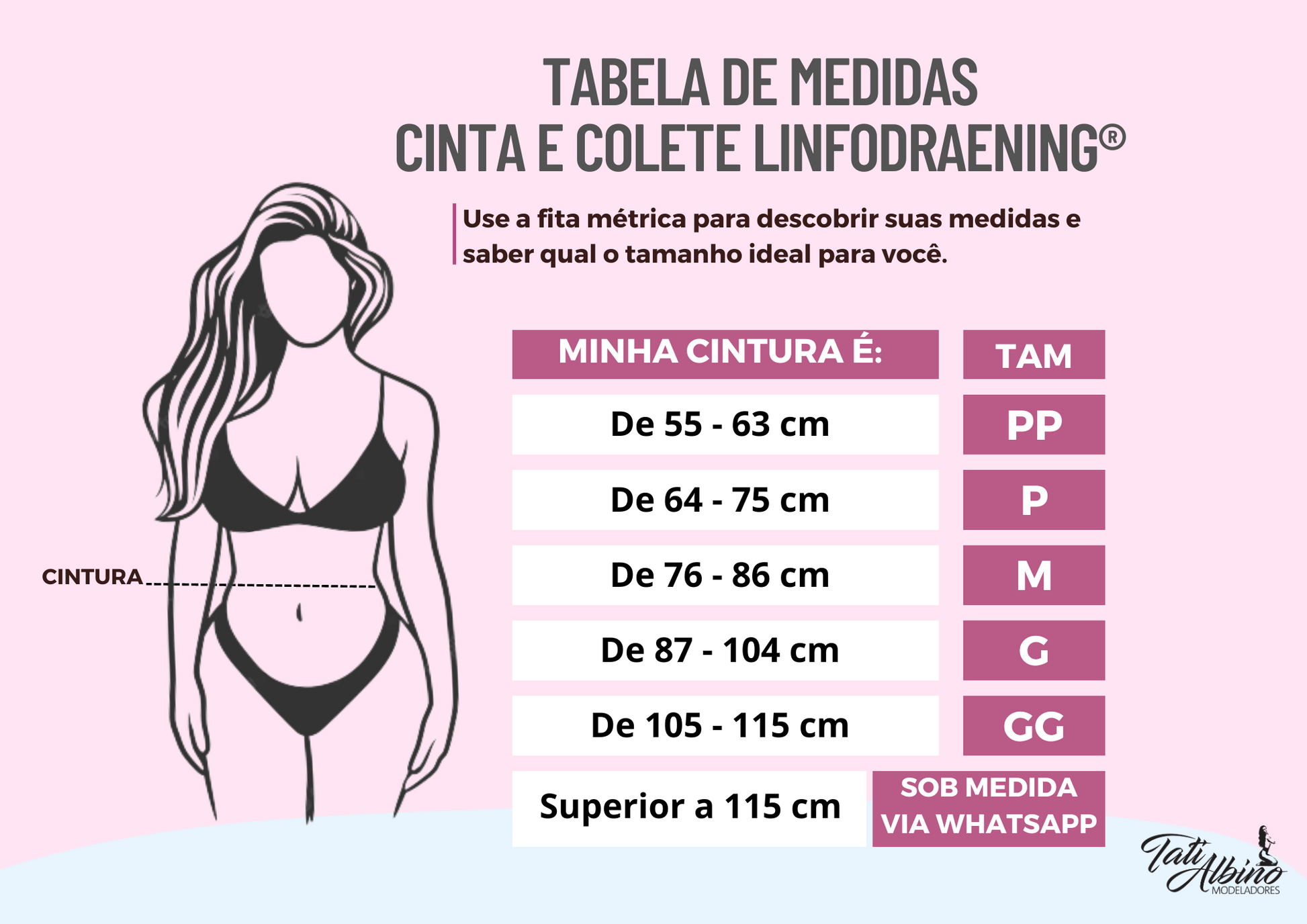 Os tamanhos das cintas Linfodraening® variam do S ao XXL, e são baseados a partir da altura e medida da cintura, que devem ser consultados na tabela de medidas na fotos do produto.
