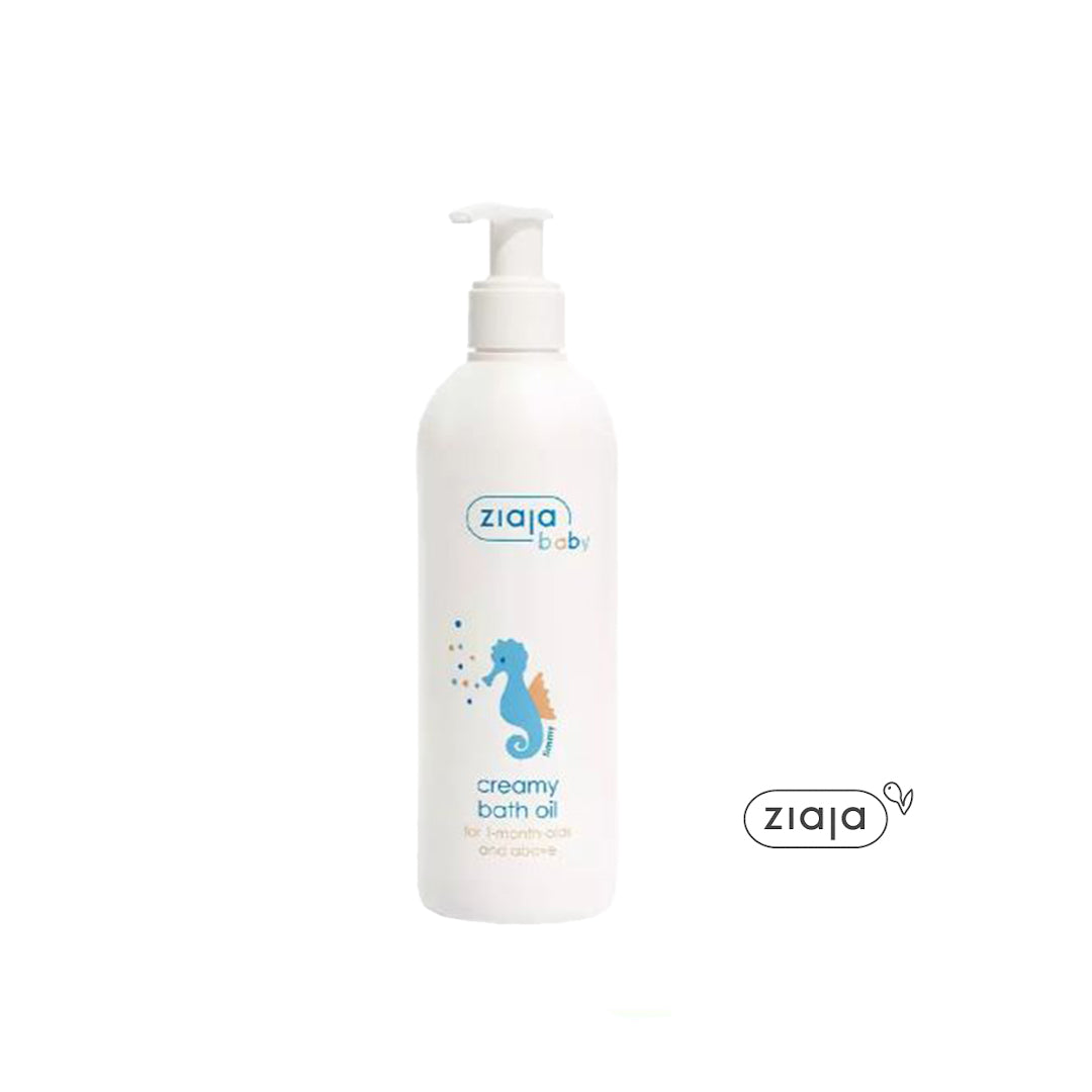 Óleo de banho cremoso hipoalergênico para bebês a partir de um mês de idade. Adequado para limpeza do corpo, rosto e cabeça.